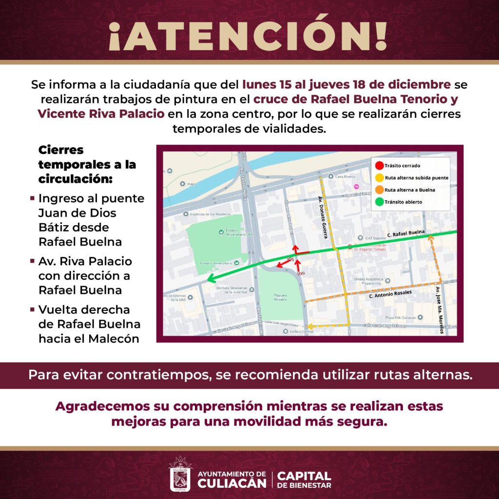 El Ayuntamiento de Culiacán anunció una intervención importante en la movilidad del centro de la ciudad que implicará cierres parciales a la circulación a partir del próximo lunes 15 de diciembre. Se trata del crucero conformado por las calles Rafael Buelna Tenorio y Vicente Riva Palacio, un punto neurálgico donde diariamente convergen más de nueve mil estudiantes y trabajadores de 31 negocios cercanos. Las obras, que se extenderán hasta el jueves 18 de diciembre, forman parte del proyecto «Pasos por la Paz», una iniciativa impulsada en conjunto con Bloomberg Philanthropies y MAPASIN para mejorar la seguridad vial.