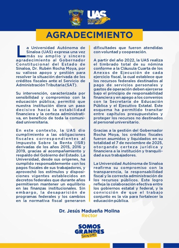 De acuerdo con el comunicado firmado por el rector Jesús Madueña Molina, la intervención del Gobierno del Estado permitió liquidar los créditos fiscales correspondientes a los ejercicios 2015, 2016 y 2019, los cuales fueron asumidos y saldados en su totalidad el 7 de noviembre de 2025.