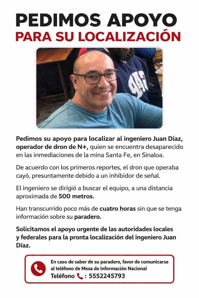 ​La cobertura periodística del rescate en la mina Santa Fe, en El Rosario, se ha visto empañada por la desaparición del ingeniero Juan Díaz, operador de dron de la cadena de noticias N+. De acuerdo con una ficha de búsqueda difundida de manera urgente, el colaborador fue visto por última vez durante el medio día de este jueves 2 de abril, cuando se internó en la zona para recuperar su equipo de trabajo.