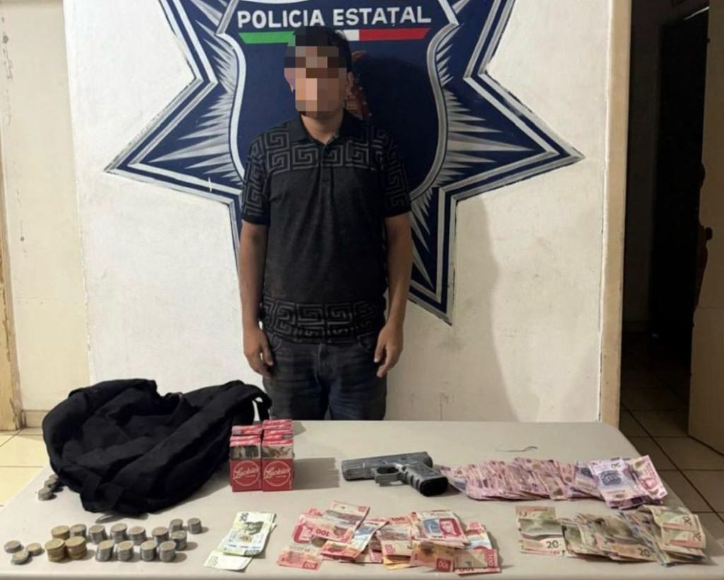 Gracias a un reporte oportuno al 9-1-1, policías estatales, apoyados por elementos del Ejército Mexicano, Guardia Nacional, Secretaría de Marina y autoridades de seguridad federales y estatales, detuvieron a un hombre en posesión de una réplica de arma de fuego, dinero en efectivo y mercancía robada.
