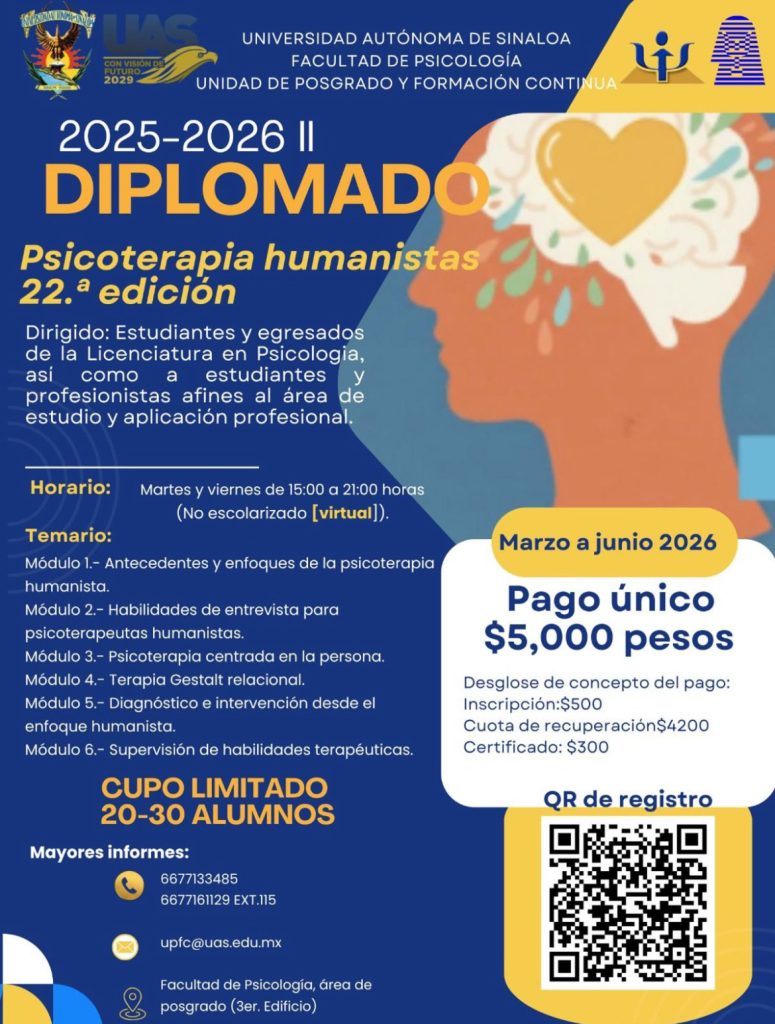 De acuerdo con la UAS, la oferta contempla cinco diplomados profesionalizantes, de los cuales aún hay cupo en áreas como Psicoterapia Humanista, Psicología de la Salud, Psicoterapia Basada en Evidencia y Psicoterapia Cognitivo-Conductual, dirigidos a estudiantes, egresados y profesionales afines.