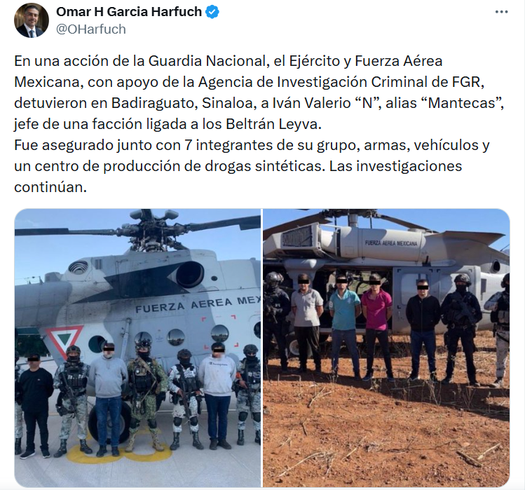 A través de un mensaje en sus canales oficiales, el Secretario de Seguridad y Protección Ciudadana, Omar García Harfuch, confirmó la captura de Iván Valerio, alias “El Mantecas”, en el municipio de Badiraguato, Sinaloa. En este reporte oficial, la autoridad federal precisó que el detenido es identificado como el jefe de una facción criminal ligada a la organización de los Beltrán Leyva.