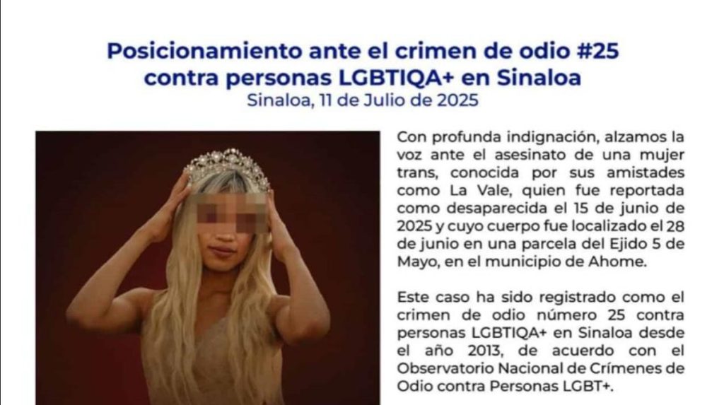 Además, instaron a los medios de comunicación a respetar su identidad de género y a evitar narrativas que borren o nieguen su condición como mujer trans. Según el Observatorio Nacional de Crímenes de Odio contra Personas LGBTI+, este caso sería el número 25 registrado en Sinaloa desde 2013.